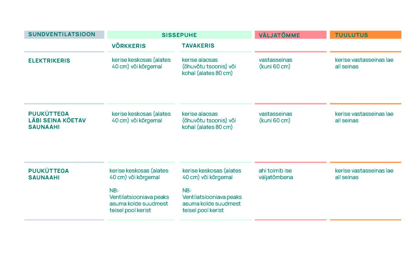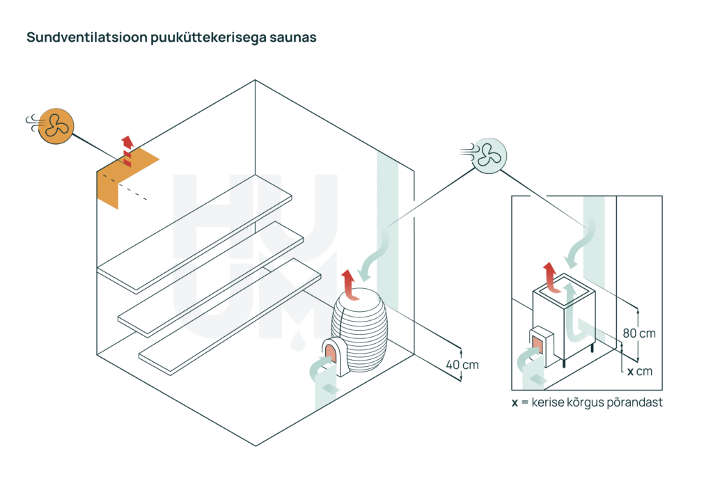 Sundventileeritud saunas on elektri- ja kõrvalruumist köetava puuküttekerise ventilatsioonilahendused samasugused. Leiliruumist köetav puukütteahi väljapuhkeava ei vaja.