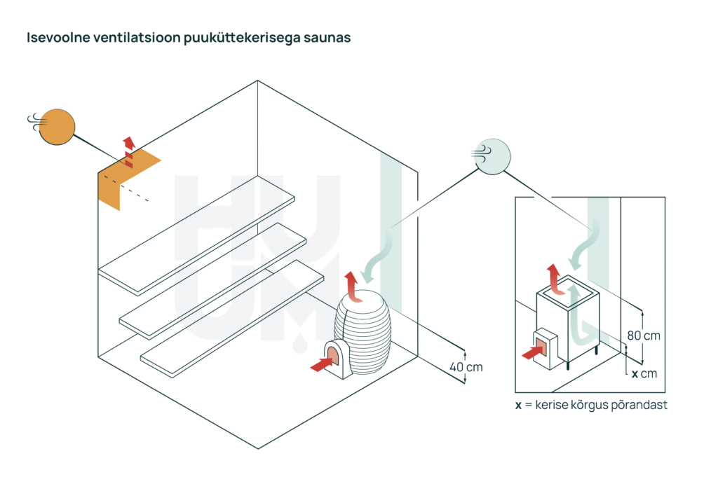 Isevoolse õhuvahetusega saunas on elektrikerise ja kõrvalruumist köetava puuküttekerise ventilatsioonilahendus samasugune ning leiliruumist köetava puuküttekerisega erinev.